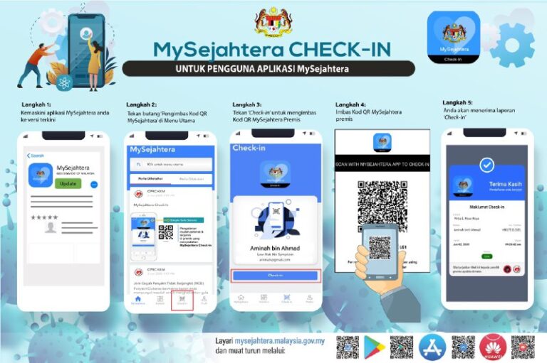 Gunakan MySejahtera Check-In untuk membantu mendaftarkan kemasukan anda di pusat membeli belah, kedai-kedai, pejabat, restoran dan juga pengangkutan awam!Ia cukup mudah, cepat dan selamat!Ikuti langkah-langkah berikut untuk menggunakan MySejahtera Check-In: